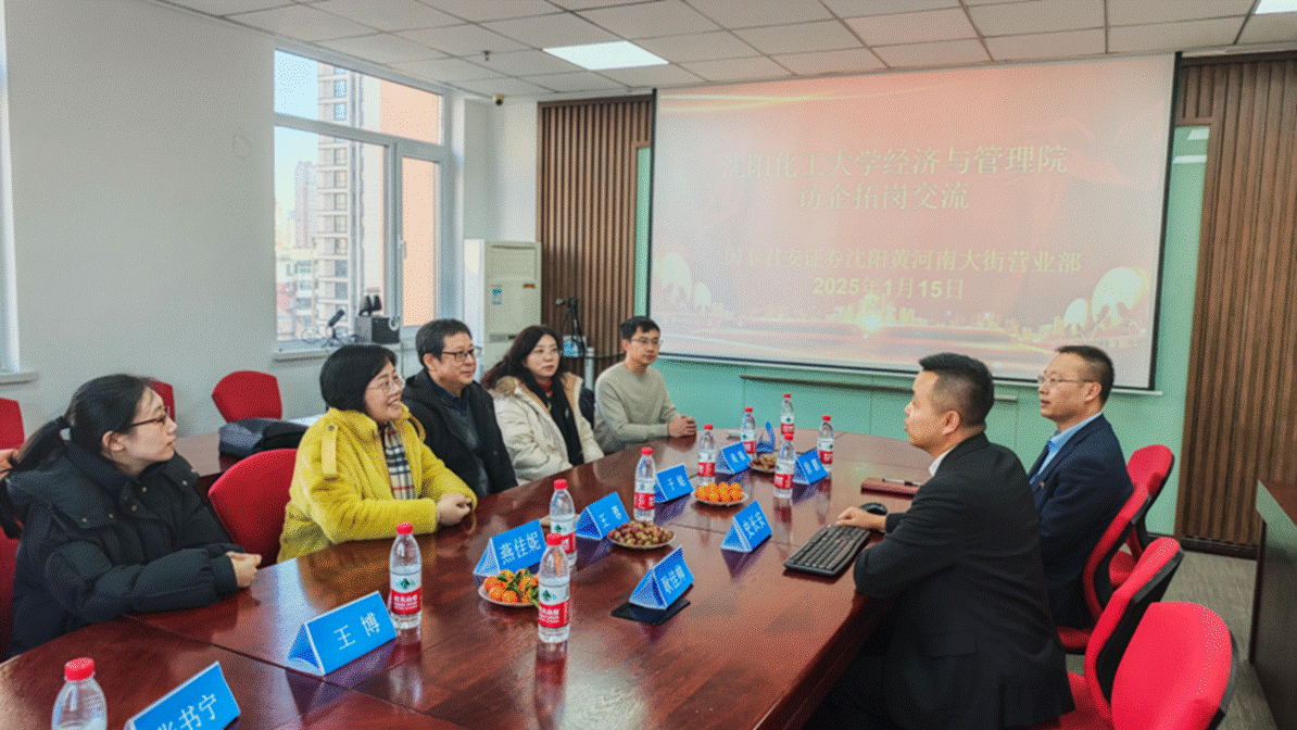 2025年1月15日,pp电子游戏平台官网院长王蓉、金融学教研室主任于铭、专业教师周颖、燕佳妮、毕业生辅导员、在读研究生等一行7人前往国泰君安证券沈阳黄河南大街营业部开展访企拓岗活动,与营业部总经理史长安、党支部书记徐鹏、业务骨干耿佳帅进行交流探讨。